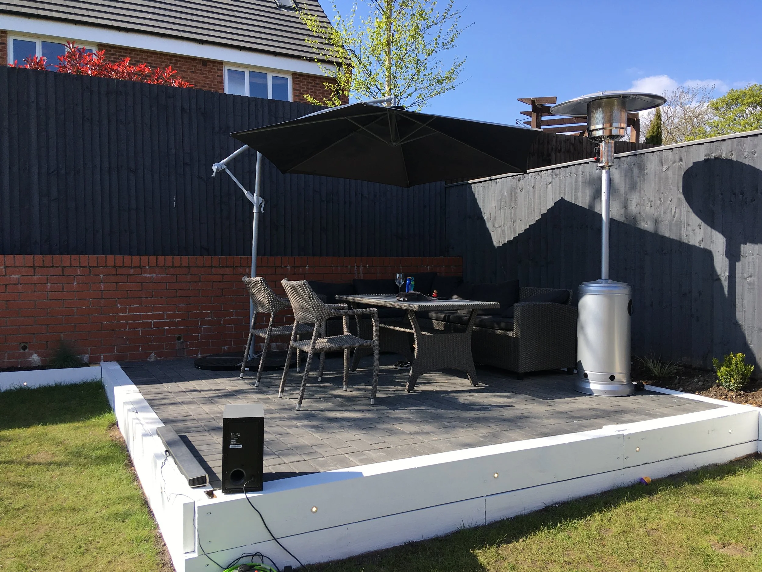 Scope: Installation of raised sitting area with illuminated timber sleepers. New illuminated timber sleeper border around the garden perimeter with new plants / flowers.